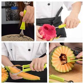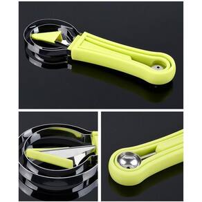 Facilite o preparo de frutas com o fatiador de frutas GXM Fatiador De Frutas 4 Em 1 Inox, ideal para cortar melancia, melão e outras opções. O modelo reúne praticidade e versatilidade ao permitir diferentes tipos de cortes em uma única peça compacta. Com 2 fatiadores redondos de tamanhos distintos, lâmina em formato V e colher para esferas, você consegue decorar pratos e servir porções de forma mais organizada. Indicado para frutas como melancia, melão, pitaya e kiwi, se adapta bem ao uso em cozinhas domésticas e no dia a dia. A combinação de plástico e aço inoxidável oferece um acessório funcional para quem busca mais agilidade no corte e apresentação das frutas.
