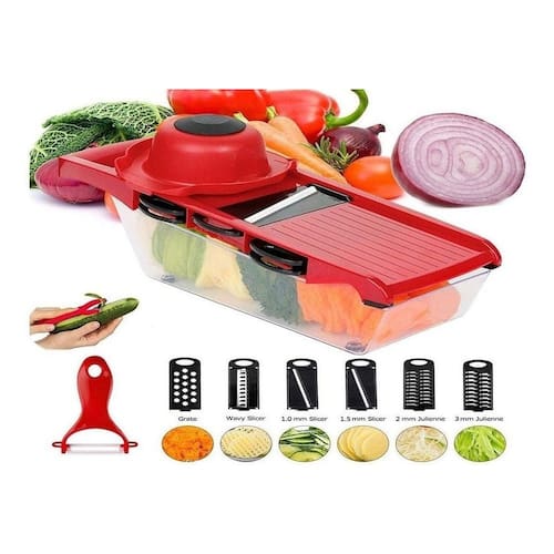 Por que o nosso Mandoline Slicer é indispensável? 6 Funções em 1: Fatie, rale e corte legumes, verduras e frutas em diferentes formatos e espessuras (julienne, fatias finas/grossas, ondulado, ralado). Tudo em um único aparelho! Lâminas de Aço Inoxidável: Ultra afiadas e duráveis, garantem cortes perfeitos e consistentes em segundos. Prepare saladas impecáveis, batatas fritas crocantes e muito mais! Segurança Máxima: Acompanha um protetor de mão ergonômico que garante total segurança durante o uso, mantendo seus dedos longe das lâminas. Design Inteligente e Compacto: Fabricado em ABS e PC de alta resistência na vibrante cor vermelha, é leve, fácil de manusear e ocupa pouco espaço. As lâminas são armazenadas no próprio corpo do mandoline, evitando perdas e mantendo sua cozinha organizada. Fácil de Limpar: Desmontável para uma lavagem rápida e sem complicações. Otimize seu Tempo: Reduza drasticamente o tempo de preparo de alimentos, liberando você para aproveitar o que realmente importa!