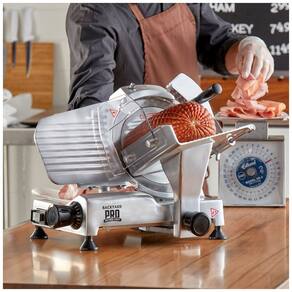 O Fatiador de Carne Manual Backyard Pro SL109E Butcher Series 9 é ideal para cortes ocasionais de ingredientes frescos na cozinha. Fabricado em alumínio resistente, possui afiador de lâmina embutido e protetor de anel fixo para segurança. Com design de 110V e 120W, é perfeito para uso em cafeterias, pizzarias, buffets e restaurantes de pequeno porte. Fácil de limpar e manter, com bandeja de aço inoxidável. Versátil e seguro para uso diário.