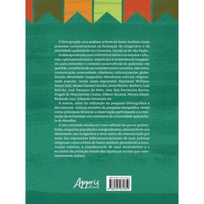 O livro propõe-se a analisar a Festa de Santo Antônio como processo comunicacional na formação do imaginário e da identidade quilombola em Cananéia, litoral sul de São Paulo. A obra apresenta como referencial teórico os estudos culturais, o pensamento latino-americano e os estudos do imaginário para entender o contexto sociocultural do quilombo em questão, considerando as conexões entre conceitos, tais como: comunicação, comunidade, cidadania, cultura popular, globalização, identidade, imaginário, hibridismo cultural, religiosidade popular, tendo como expoentes: Raymond Willians, Stuart Hall, Nestor Garcia Canclini, Jesús Martín-Barbero, Luiz Beltrão, José Marques de Melo, Ana Taís Portanova Barros, Magali do Nascimento Cunha, Gilbert Durand, Mircea Elíade, Riolando Azzi, Eduardo Hooarnet etc. A autora, além da utilização da pesquisa bibliográfica e documental, utilizou também da pesquisa etnográfica, tendo como principais técnicas: a observação participante e a realização de entrevistas com membros da comunidade quilombola do Mandira. O seu conteúdo resulta em uma reflexão de que os quilombolas, enquanto populações marginalizadas, desenvolvem sua identidade, seu imaginário e seus meios de comunicação por meio das expressões folkcomunicacionais de suas práticas religiosas, como a Festa de Santo Antônio, permitindo a construção coletiva, a manifestação de seus sentimentos e o encontro de proteção diante das injustiças sociais que constantemente sofrem.