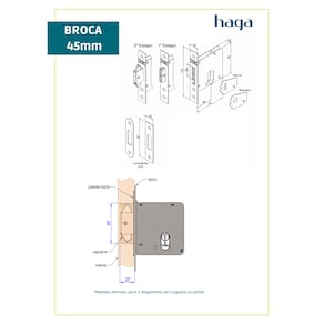Roseta: 528 em aço inox Broca: 45 mm Testa e Contra Testa: Cantos retos, fabricadas no material correspondente ao acabamento Contra Testa: Referência 610/620 – 2 furos Indicação de uso: Porta de correr interna