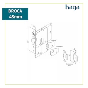 Roseta: R529 em aço inox Cilindro: 5A (60 mm) Broca: 45 mm Contra Testa: Ref. 603 – 2 furos Testa e Contra Testa: Com cantos retos, fabricadas conforme o acabamento Uso indicado: Portas externas de bater