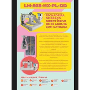 Fechadeira de Braço 3 agulhas, Ponto Corrente, com 2 catracas de Ferro, lubrificação automática e sistema de transporte rolamentado. Possui um conjunto de duas catracas de ferro para transportar materiais pesados. Ideal para costurar jeans e tecidos de grossa espessura. A máquina acompanha aparelho de embainhar, para operações de fechamento lateral entre pernas de calças. A catraca de ferro inferior é conectada junto ao dente para transportar melhor o tecido evitando ondulações no meio da costura. Conjunto de chapa dente e calcador foram projetados para costuras de materiais pesados.