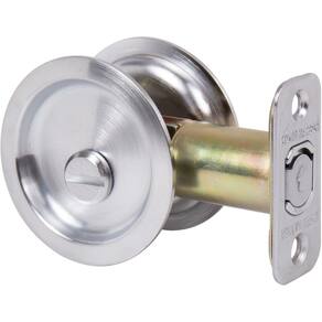 — Fechadura de privacidade: as fechaduras de bolso redondas de privacidade apresentam uma trava de privacidade, permitindo que os ambientes internos de uma casa sejam protegidos com segurança. Especificamente, esse hardware possui uma trava com um dente que se encaixa na placa de impacto incluída para manter a porta fechada. Do interior, esse tipo de fechadura de bolso só pode ser trancado e desbloqueado por meio de um botão giratório. Além disso, como um recurso de segurança, esse tipo de fechadura de bolso pode ser desbloqueado do exterior usando uma moeda ou uma chave de fenda de cabeça chata.