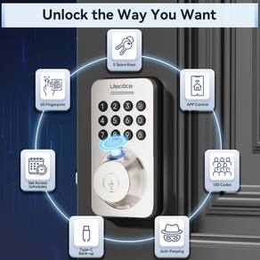 - Desbloqueio 5 em 1: 50 grupos de impressões digitais, 50 grupos de códigos de acesso do teclado, desbloqueio via aplicativo dentro de 50 metros, desbloqueio com um toque e as teclas podem ser usadas para desbloquear. As fechaduras de porta com impressão digital podem gerar e compartilhar código único, permanente, cronometrado, recorrente, código personalizado e apagar código com visitantes diferentes e seus amigos.