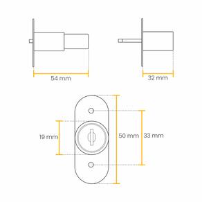 - Marca: HD - Material: Aço com Acabamento Cromado - Comprimento Total: 54 mm - Diâmetro do Corpo: 32 mm - Base Frontal: 50 x 19 mm - Distância entre Furos: 33 mm