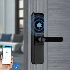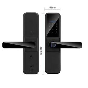 Fechadura com controle por senha, cartão, chave e aplicativo. Modelo com acabamento preto, compatível com portas padrão.