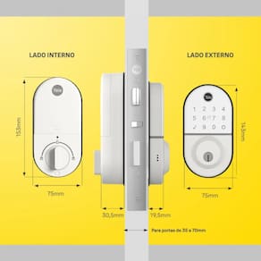Fechadura Digital Compact Branca Rolete - Yale A Fechadura Digital Compact da Yale é uma opção moderna e segura para quem busca praticidade e tecnologia. Obs: Somente a lado externo da fechadura (painel com display) pode ficar exposto ao tempo. - Espessura de Porta: 35 a 70mm - Até 250 Senhas - Até 250 Biometrias - Até 250 Tags - Guia de Voz 3 idiomas: Inglês, Espanhol e Português - 4 Pilhas AA alcalinas autonomia de até 3.600 acionamentos - Resistente a intempéries. Somente a lado externo da fechadura (painel com display) pode ficar exposto ao tempo. - Garantia do fabricante: 24 meses - Tipos de abertura: Senha numérica, biometria, cartão e chave de segurança