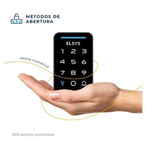 Fechadura digital de sobrepor dance esf-ds910v preta elsys Diferenciais do produto: Trava dupla Abertura por senha numérica principais características: Suporta até 200 senhas numéricas Travamento automático da porta Campainha sonora características: Alimentação via pilha, funciona mesmo sem energia elétrica no local Aviso de bateria fraca & plug para alimentação de emergência Teclado touch luminoso com tecla elsys Compatível com diversos tipos de porta, de espessura entre 30 e 60 mm, com abertura para a direita ou esquerda Campainha sonora tecla sempre visível Função senha segura: permite digitar números aleatórios antes ou depois da senha verdadeira Função convidado: permite criar senhas temporárias de uso único Bloqueio automático Bloqueio após 5 tentativas falhas de desbloqueio