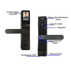 A fechadura possui aviso de bateria fraca e abertura mecânica através de chave.
