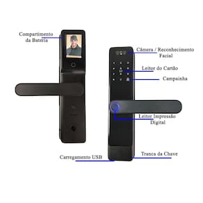 A fechadura possui aviso de bateria fraca e abertura mecânica através de chave.