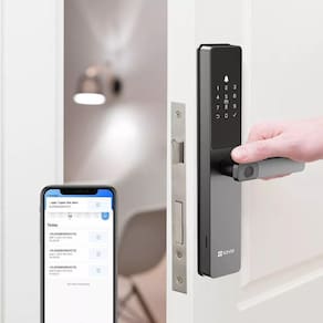 Você pode destravar a fechadura usando impressão digital, senha, cartão de proximidade, chave mecânica em emergências ou smartphone via Bluetooth ou Wi-Fi usando o aplicativo EZVIZ.