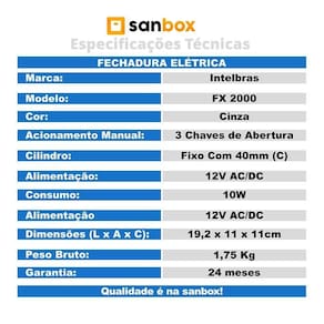 A Fechadura Elétrica De Sobrepor Preta Cilindro Fixo Da Intelbras FX 2000 é um produto extrema qualidade e segurança com um ótimo custo-benefício para o travamento de portas e portões da sua residência ou apartamento. A FX 2000 oferece muito mais segurança e praticidade Sua instalação é de sobrepor com cilindro fixo com 40 mm de comprimento, e pode ser aplicada portas e portões de metal ou madeira, com abertura para direita ou esquerda. Essa fechadura possui memória mecânica que destrava ao primeiro impulso. . O tambor da fechadura pode ser substituível, com isso, você pode manter o tambor da fechadura antiga e evitar a troca de chaves. Além disso, junto a fechadura FX 2000 acompanha 3 chaves. Especificações -marca: Intelbras -modelo: FX 2000 -GTIN/ EAN: 7896637675246 -cor: cinza -aplicação: em Portas de Metal ou Madeira com abertura à Direita ou à Esquerda -tambor: Substituível -acionamento Manual: 3 Chaves de Abertura dos Cilindros (Externos e Internos) -memória Mecânica: Destrava ao primeiro impulso -cilindro: Fixo com 40mm de Comprimento -alimentação: 12 V AC/DC -consumo: 10W -acompanha Chaves: Sim, 3 Chaves Físicas -dimensões do Produto (L x A x C): 19,2 x 11 x 11cm -peso Bruto: 1,75 Kg Itens inclusos -01 Fechadura Elétrica FX 2000 -01 Batente -01 Base do Batente -08 Parafusos Auto Atarrachante 3x 16mm -01 Espelho -01 Manual Garantia -garantia de fábrica: 24 Meses