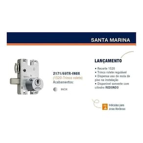Fechadura 2171tr/69-inox porta blindex pivotante com lingueta rolete e pino regulável, cilindro redondo, acabamento inox.Marca: arouca;Acabamento: inox;Caixa: aço inoxidável;Lingueta: rolete e pino;Aplicação: externa;Padrão: blindex:Linha: vidroChaves : 02;Tamanho da fechadura:Altura: 70mmProfundidade: 41mmEspessura: 13mm- não acompanha contra testa- não acompanha os acabamento/espelhos