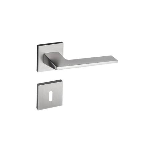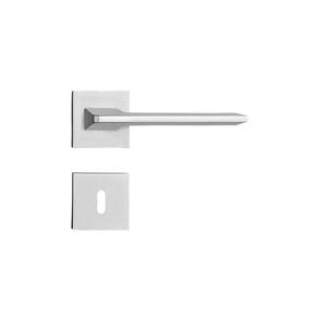 Guarnição: 4 Rosetas em Zamac (fixadas por pressão em almas plásticas fixadas na porta por parafusos auto-atarrachantes de cabeça fenda philps em latão)