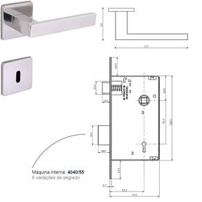 A Fechadura Interna Quadra 4098594/55 - Inox Polida possui maçaneta e roseta também em inox, o que garante a sua durabilidade e resistência ao desgaste. A máquina utilizada é a 4040/55 e a distância de broca é de 55mm.