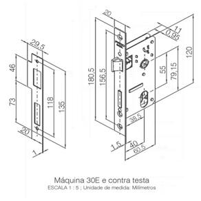 Máquina para porta externa 30e (testa fixa) Broca de 40mm Tráfego médio Grau de segurança média Sistema de reversão do trinco sem necessidade de ferramentas Caixa e tampa em aço galvanizado Trinco e lingueta em zamac pintado de preto Testa e contra testa em aço inoxidável pintado de preto