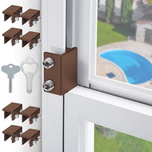 Fechaduras de janela deslizantes, travas de janela para janelas deslizantes horizontais, trava de segurança de janela com chave, trava de alumínio ajustável para instalar rolha de janela, travas para janelas para cima e para baixo (8 conjuntos marrom)