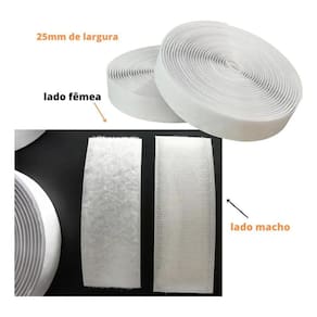 O fecho de contato adesivo dupla face macho e fêmea é muito útil de diversas maneiras, como telas mosquiteiras, quadros, costuras e várias outras formas. ao tecido adesivo. Possui adesivo autocolante nos dois lados com ótima fixação. A fita fixadora de fecho autoadesivo é composta por: - 5 metros com adesivo macho - 5 metros com adesivo fêmea - 25mm 2,5cm de largura. - Cor Branca - Composição 70% Poliéster 30% Poliamida Marca: Não Informado Ean: 79011504873908