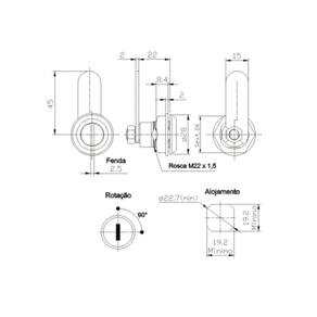 - Fecho fabricado com corpo e porca em nylon preto - Lingüeta reta em aço niquelado - Canhão em zamak niquelado com fenda - Destinado para painéis de aço - Necessário de um recorte na porta com quadrado de 19,6 mm ou furo com diâmetro de 22,5 mm com chapa estampada sobreposta - Permite a montagem do fecho no painel sem a necessidade em desmontar a lingüeta