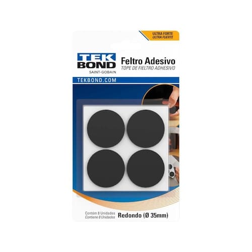 - Marca: Tekbond; - Formato: Redondo; - Cor: Preto; - Composição: Material à base de viscose e poliéster; - Contém 8 unidades; - Absorve o impacto de batidas ou quedas e previne problemas com riscos, protegendo objetos, pisos e diferentes superfícies com eficiência, de forma prática e rápida; - Ideal para usar em móveis para proteger pisos delicados, para evitar deslizamentos, riscos e batidas causadas pela movimentação de móveis; - Possui excelente aderência em diversas superfícies.