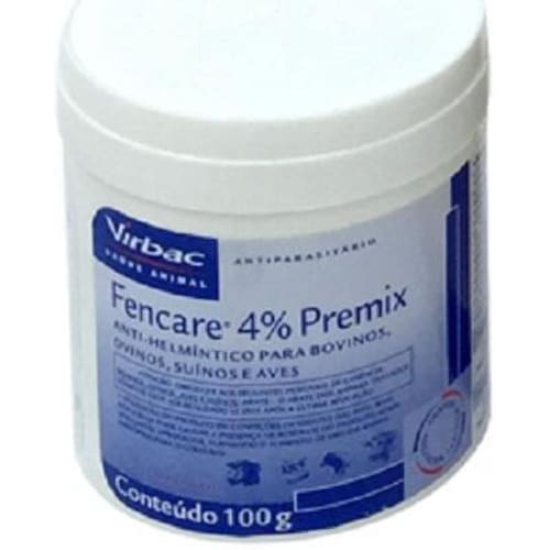 Fencare 4% Premix é um tratamento de verminoses gastrintestinais e pulmonares de bovinos, ovinos, suínos e aves causadas por nematódeos. Combate também a Moniezia. O produto apresenta ações ovicida, larvicida e vermicida. Fórmula Cada 100g do produto contém: Fembendazole........................4 g Excipiente.....Q.S.P..............100 g Posologia Administrar, misturado à ração, 5 mg de fembendazole por kg de peso corporal, o que corresponde a 1 g de Fencare® 4% Premix para cada 8 kg de peso corporal. Nas infestações causadas por Trichuris suis e Metastrongylus sp., usar de 20 a 30 mg de fembendazole por kg de peso corporal, o que corresponde a 0,5 a 0,75 g de Fencare® 4% Premix por kg de peso corporal. Contraindicações Não administrar durante 7 dias após a administração de antiparasitários hepáticos contendo bromo. Precauções Fechar bem a embalagem após o uso. Período de carência: Suspender a medicação, 15 dias antes do abate dos animais ao consumo humano. Fabricante: Virbac Ean: 7897515650546