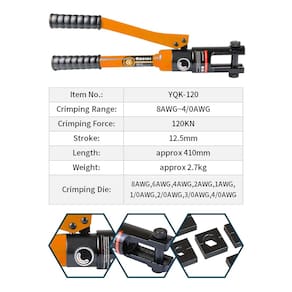 Crimpagem poderosa e confiável: experimente o desempenho excepcional de crimpagem com nossa ferramenta de crimpagem hidráulica AMZCNC com uma força de crimpagem robusta de 12T para conexões seguras e profissionais. - Crimpagem poderosa e confiável: experimente o desempenho excepcional de crimpagem com nossa ferramenta de crimpagem hidráulica AMZCNC com uma força de crimpagem robusta de 12T para conexões seguras e profissionais. - Tamanhos versáteis: nossa ferramenta de crimpagem inclui 9 pares de tamanhos específicos de matriz (8, 6, 4, 2, 1, 1/0, 2/0, 3/0, 4/0 AWG), projetados para acomodar uma ampla variedade de tamanhos de cabos com precisão e precisão. - Construído de acordo com os padrões americanos: nossos moldes utilizam matrizes padrão americano, garantindo compatibilidade com conectores comumente utilizados e fornecendo resultados confiáveis e consistentes. - Qualidade : feita com a máxima precisão e durabilidade, nossa ferramenta de crimpagem hidráulica AMZCNC é projetada para atender às demandas de profissionais, eletricistas e entusiastas de bricolage, oferecendo desempenho confiável e duradouro. - ampla variedade de aplicações: esta ferramenta versátil é adequada para vários projetos elétricos, incluindo cabos de bateria, fios de energia, cabos elétricos e muito mais. Libere seu potencial em aplicações automotivas, industriais e residenciais.