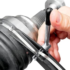 Ferramenta para apertar abraçadeiras metálicas do tipo zip / zip tie / fita, aplicadas em coifas de juntas homocinéticas de automóveis e utilitários e em diversas aplicações industriais.