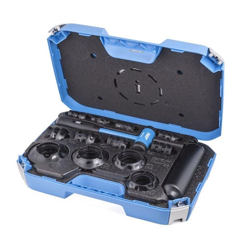 O TMFT 36 facilita a montagem de diferentes rolamentos com diâmetros do furo de 10 a 55 mm (0,39 a 2,17 pol.). A combinação correta de anel de impacto e bucha possibilita a transmissão eficaz da força de montagem ao anel do rolamento com o ajuste interferente, minimizando o risco de danos às pistas ou elementos rolantes do rolamento. O TMFT 36 é adequado também para a montagem de outros componentes, como buchas, vedações e polias.