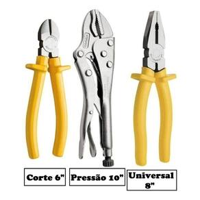 • O Alicate Pressão de 10 polegadas vai facilitar muito mais o corte, solda, lixa e outros trabalhos que precisem que o objeto esteja fixado. • O alicate de corte diagonal de 6 polegadas, muito utilizado para cortar fios e arames com uma ótima precisão. • Por fim, o alicate universal de 8 polegadas é muito versátil, pois ele une a função do alicate de bico e de pressão. Garanta já o seu kit e complete sua caixa de ferramentas!