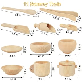 - Uma caixa de madeira para ferramentas sensoriais: inclua um cesto sensorial de madeira para seus filhos armazenarem 11 brinquedos sensoriais de madeira, as crianças podem derramar grãos, feijão, aveia, arroz, pedras, areia e outras partículas nesta caixa de madeira, e use as ferramentas sensoriais para despejar, transferir, colher e empilhar, praticar usar as ferramentas de cozinha, Traga a alegria da vida real para as crianças