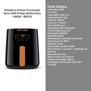 Fritadeira elétrica com capacidade de 4,1 L, indicada para porções de até 800 g. Possui painel sensível ao toque com 7 modos de preparo: petiscos congelados, batatas, carne, peixe, frango, bolo e vegetais. Ajuste de temperatura de 80 a 200 graus e temporizador de até 60 minutos. Acessórios removíveis com revestimento antiaderente, compatíveis com lava-louças.