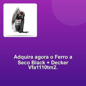 Descubra a eficiência e praticidade do Ferro a Seco Black + Decker Vfa1110tm2 220V. Com um design compacto, suas dimensões de 12 cm de largura, 12 cm de altura e 24 cm de comprimento garantem fácil manuseio e armazenamento. Pesando apenas 0,78 kg, é leve e ideal para uso diário. Este ferro oferece um deslizamento suave, proporcionando roupas impecáveis em menos tempo. A tecnologia avançada da Black + Decker assegura durabilidade e desempenho superior, tornando-o um aliado indispensável para quem busca qualidade e eficiência na hora de passar roupas.