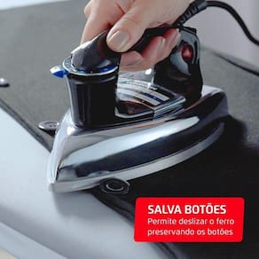Salva-botões:As reentrâncias nas laterais do bico são sob medida para que o ferro deslize e desamasse o tecido entre os botões sem risco de danificá-los ou desprendê-los.
