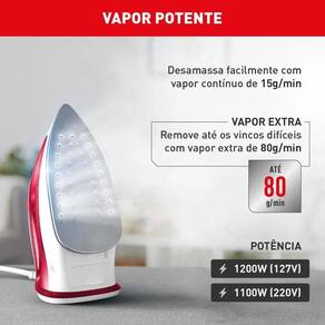 Conta com Vapor Contínuo de até 15g/min e Vapor Extra de até 80g/min que ajudam a suavizar as fibras dos tecidos e tornam o processo de passar muito mais simples e eficaz. Dispõe de 3 configurações de temperatura, Função Spray, tanque de água com capacidade de 180 ml, Alça ergonômica para um manuseio mais confortável e Sistema Anti-calcário que prolonga a durabilidade do ferro, mantendo-o sempre limpo e pronto para uso.