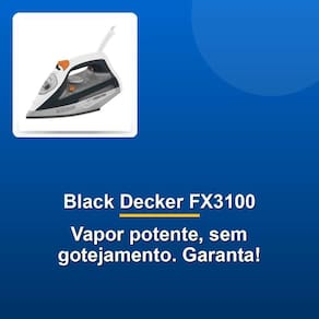 Ferro A Vapor Black Decker Fx3100 Br Anti Gotejamento 110v Descubra a eficiência do Ferro a Vapor Black Decker FX3100 BR Anti Gotejamento 110V. Com capacidade de 470 ml, ele garante longas sessões de passar sem interrupções. Seu design em plástico resistente e cabo de 1,93m proporcionam praticidade e mobilidade. Com potência de 1200 Watts, oferece um desempenho excepcional, enquanto a tecnologia anti-gotejamento evita manchas indesejadas. O vapor contínuo de 22,4 g/min penetra profundamente nos tecidos, eliminando até os vincos mais difíceis. Economize energia com um consumo de apenas 0,89 kWh. Descubra a eficiência do Ferro a Vapor Black Decker FX3100 BR Anti Gotejamento 110V. Com capacidade de 470 ml, ele garante longas sessões de passar sem interrupções. Seu design em plástico resistente e cabo de 1,93m proporcionam praticidade e mobilidade. Com potência de 1200 Watts, oferece um desempenho excepcional, enquanto a tecnologia anti-gotejamento evita manchas indesejadas. O vapor contínuo de 22,4 g/min penetra profundamente nos tecidos, eliminando até os vincos mais difíceis. Economize energia com um consumo de apenas 0,89 kWh. Marca: Não Informado Ean: 7899497695089