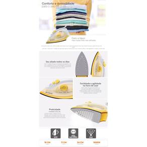 O ferro de passar é uma tecnologia que trouxe comodidade e conforto para a dona de casa. A praticidade combinada com rapidez e eficiência, torna sua presença indispensável em um lar. Passa a vapor e a seco. Base antiaderente: mais deslizante. Spray de água: facilidade para passar as roupas e franzidos mais difíceis. Borda salva botões em toda a lateral, para não danificar os botões e os tecidos. Apoio traseiro que permite deixar na posição vertical. Botão giratório seletor de temperaturas: permite escolher a temperatura ideal para cada tipo de tecido. Luz indicadora de aquecimento. Cordão elétrico articulado.