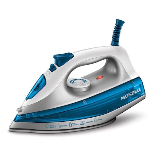 Aquele ferro prático que cabe em qualquer lugar... O Ferro a Seco com Base de Alumínio Polido FSN-55-BL azul da Mondial é um ferro de passar roupas que aquece rápido, desliza com segurança, tem 6 temperaturas e 1000W de potência. Com design anatômico, o FSN-55-BL tem estilo moderno e seu deslizamento fácil faz com que passar roupas não seja um sufoco ou musculação. Sua base de alumínio polido permite a distribuição uniforme e rápida do calor, portanto serve muito bem a quem não precisa de vapor para desamassar os vincos mais difíceis - e é perfeito para aqueles que gostam de dar uma alisada rápida nas peças antes de vestir e sair. O Ferro de passar FSN-55-BL conta com 6 níveis de temperaturas para ser adequado a tecidos dos mais leves e delicados aos pesados, de fios naturais. Com proteção e segurança, conta com salva-botões em toda a base e lâmpada piloto que indica quando está ligado. 1 ano de garantia, desenvolvido para uso doméstico.