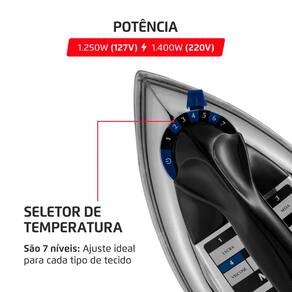 Seletor com 7 níveis de temperatura: sem complicações, você ajusta com precisão a temperatura para o tipo de tecido que será passado, evitando danos e prolongando a vida útil das roupas.