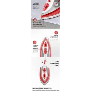 VAPOR CONTÍNUO E SPRAY: O ferro libera alta quantidade de vapor e possibilita remover os amassados das roupas. Além disso, o spray umedecedor é mais um aliado na tarefa e facilita a retirada dos vincos mais difíceis.