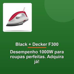 Ferro De Passar Black + Decker F300 1000w Seco 110v Descubra a eficiência do Ferro de Passar Black + Decker F300 1000W. Com um design compacto e leve, pesando apenas 540g, ele é ideal para manuseio fácil e confortável. Seu cabo de 1,4 metros oferece liberdade de movimento, enquanto a temperatura ajustável de até 176C garante roupas impecáveis. O consumo de energia de 0,282 kW/h é econômico, e a frequência de 60Hz assegura desempenho consistente. Certificado pelo selo SGS-OCP-0040, este ferro é a escolha perfeita para quem busca qualidade e praticidade no dia a dia. Descubra a eficiência do Ferro de Passar Black + Decker F300 1000W. Com um design compacto e leve, pesando apenas 540g, ele é ideal para manuseio fácil e confortável. Seu cabo de 1,4 metros oferece liberdade de movimento, enquanto a temperatura ajustável de até 176C garante roupas impecáveis. O consumo de energia de 0,282 kW/h é econômico, e a frequência de 60Hz assegura desempenho consistente. Certificado pelo selo SGS-OCP-0040, este ferro é a escolha perfeita para quem busca qualidade e praticidade no dia a dia. Marca: Não Informado Ean: 7899497695027