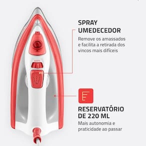 Vapor Contínuo + Spray Umedecedor: Remove vincos rapidamente.