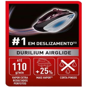 Ultra deslizamento e potência! Novo Ferro a Vapor Arno com sua Base Durilium Airglide, Tecnologia Exclusiva Arno, é número 1 em deslizamento, até +33% mais rápido e maior resistência a riscos e arranhões. Além disso, possui Vapor Vertical, Vapor Contínuo de até 25 g/min e Vapor Extra de 110 g/min, 67 furos ativos e +25% mais vapor. Ponta de Precisão que desamassa até as área de difícil acesso, Sistema Corta-Pingos que evita pingos nas roupas mesmo quando o ferro estiver em baixas temperaturas. Maior resistência, fácil de abastecer com seu tanque de 270 ml.