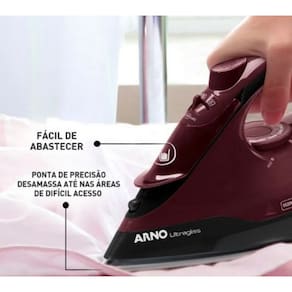 Ficha Técnica: Comprimento do fio: 2 metros Consumo de energia (kW/h): 9,6 kW/h/mes Tomada 12A (110V) e 10A (220V) Potencia: 1520W / 220V Tipo de Tomada: 12A Tipo de Plugue: 3 Pinos Lampada piloto: Sim Spray: Sim Vapor vertical: Sim Reservatorio de agua visivel: Sim Base: Durilium Airglide (antiaderente) Capacidade do reservatorio: 270ml Base antiaderente: Sim Seletor de intensidade de vapor: Sim Seletor de temperatura: Sim Cor: tom de Vermelho com Vinho