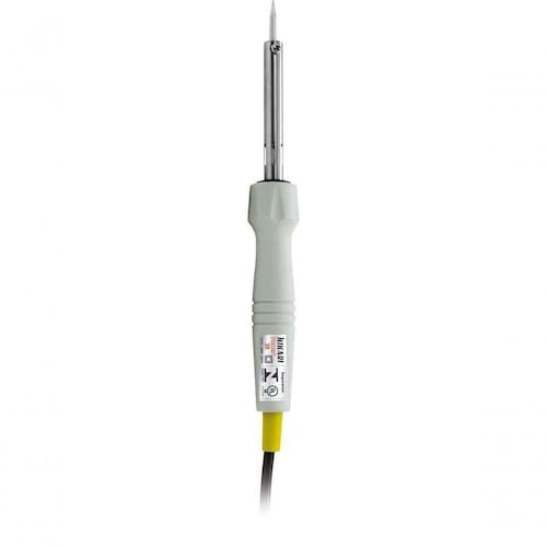 Ferro De Solda 30 Power 25w 127v CERTIFICADO PELO INMETRO Fácil reposição Tubo ventilado PBT* Antichama Acompanha suporte para ferro Fácil reposição Troca a ponta e resistência com mais facilidade. Tubo ventilado Dissipa o calor. Maior durabilidade da resistência. PBT* Antichama Esquenta menos a empunhadura. *PBT (Politereftalato de butileno) mesmo material utilizado em: tomadas, disjuntores e conectores elétricos. Dupla Isolação Protege contra choque. Potência de consumo: 25W Temperatura máxima: 410C Comprimento: 210mm Peso Total: 140g Conjunto de resistência e tubo metálico substituível Resistência de mica Ponta de longa durabilidade tratada com ferro e alumínio Instruções de Uso: Estanhe a extremidade da ponta ao ligá-lo pela primeira vez. Estanhe a ponta também todas as vezes que desligar o ferro para evitar oxidação. Este procedimento aumenta consideravelmente a vida útil da ponta. Os ferros de soldar devem ser colocados em suporte adequado quando não estiverem sendo utilizados. Como Soldar: Primeiro lixe toda sujeira, ferrugem ou tinta da área a ser soldada. Depois: Aqueça o local com ferro de soldar. Aplique a solda na parte a ser soldada. Espere a solda esfriar antes de movimentar as partes soldadas. CERTIFICADO PELO INMETRO Fácil reposição Tubo ventilado PBT* Antichama Acompanha suporte para ferro Fácil reposição Troca a ponta e resistência com mais facilidade. Tubo ventilado Dissipa o calor. Maior durabilidade da resistência. PBT* Antichama Esquenta menos a empunhadura. *PBT (Politereftalato de butileno) mesmo material utilizado em: tomadas, disjuntores e conectores elétricos. Dupla Isolação Protege contra choque. Potência de consumo: 25W Temperatura máxima: 410C Comprimento: 210mm Peso Total: 140g Conjunto de resistência e tubo metálico substituível Resistência de mica Ponta de longa durabilidade tratada com ferro e alumínio Instruções de Uso: Estanhe a extremidade da ponta ao ligá-lo pela primeira vez. Estanhe a ponta também todas as vezes que desligar o ferro para evitar oxidação. Este procedimento aumenta consideravelmente a vida útil da ponta. Os ferros de soldar devem ser colocados em suporte adequado quando não estiverem sendo utilizados. Como Soldar: Primeiro lixe toda sujeira, ferrugem ou tinta da área a ser soldada. Depois: Aqueça o local com ferro de soldar. Aplique a solda na parte a ser soldada. Espere a solda esfriar antes de movimentar as partes soldadas. Ean: 7899810400499