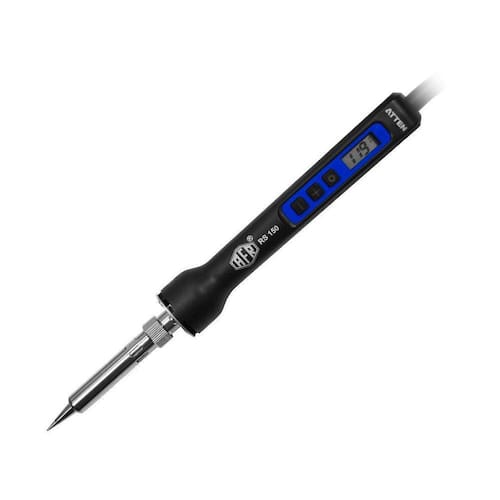 O Ferro de Soldar Digital AFR RS150 de 150 watts é um equipamento profissional e possui controle de temperatura com excelente precisãoPossui 9 Memórias de temperatura todas configuráveis além de possuir menu de Calibração de Temperatura.O Ferro de Soldar já sai com ponta cônica Lead Free de alta qualidade e durabilidade.É indicado para trabalhos em eletrônica que exige controle de temperatura com precisão.Acompanha:-ferro de Soldar com ponta Lead Free-suporte para Ferro de Soldar;Principais Características:- 9 Memórias de temperatura configuráveis- Calibração de Temperatura- Função Sleep: entra em modo sleep descanso automaticamente após 10 minutos e desliga por completo após 20 minutos sem uso;- Display LCD;- Construído no sistema PID, ajuste de temperatura por botão, fácil operação;- Cabo ergonômico;- Status de controle de temperatura através do LED azul;- Resistência e sensor de temperatura são feitos de material tipo PTC, que éExtremamente rápido no aumento de temperatura e preciso no controle deTemperatura.- Função Sleep e desligamento automático é ajustável, podendo ser desativado.- Estação, ferro e ponta aterrados;6 meses de garantia contra defeito de fabricação