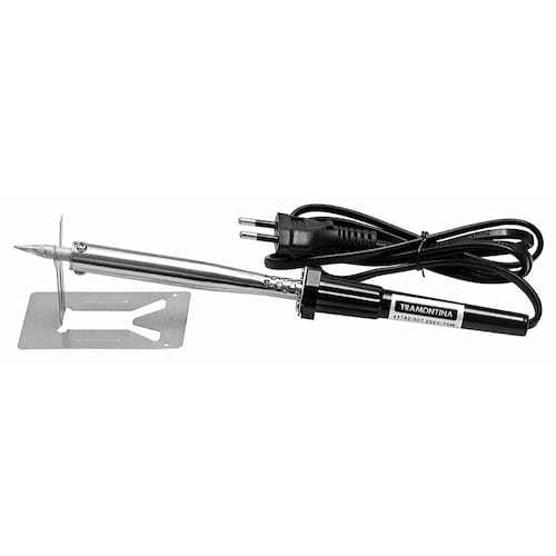 Ideal para fazer pequenos reparos! Esse ferro de solda, da Tramontina, é uma ferramenta utilizada para fazer pequenos reparos por meio de solda de estanho, e foi produzida e testada conforme normas específicas. Tem a ponteira e a haste metálicas, cabo de plástico, cabo elétrico de 1 metro, potência de 40 Watts, e ainda vem com suporte de metal para descanso.