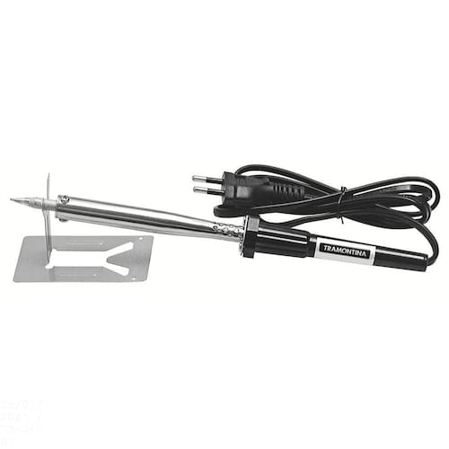 Garanta praticidade e conforto com o Ferro de Solda Tramontina 70 W 127 V com Empunhadura Plástica. Ideal para soldar equipamentos com placas eletrônicas. Possui haste e ponteira em metal e o cabo em plástico, tornando o uso mais confortável. É uma ferramenta utilitária para as tarefas cotidianas. Possui certificação Inmetro. Orientações Ponteira e haste metálicas.Cabo plástico.Suporte de metal para descanso.Cabo elétrico de 1 metro.Acompanha manual de instruções.As ferramentas são submetidas a testes de aplicação prática para garantir sua resistência durante o uso.Ferramenta utilizada para pequenos reparos por meio de solda de estanho.As ferramentas são produzidas e testadas conforme normas específicas. Características Gerais EAN13 7891114053616 DUN14 17891114053613 NCM 8515.11.00 Peso Líquido 0,0300 kg. Peso Bruto 0,0300 kg. Metragem 0,000239 m³. Dimensões Embalagem (Compr. X Larg. X Alt.) 290x 75x 11 mm. Dimensões Produto (Compr. X Larg. X Alt.) 290x 32x 7 mm. Cor 1 000000 Hexa Observações Use óculos, luvas e outros equipamentos de proteção de acordo com a tarefa a ser executada. Confira a tensão indicada no produto antes de ligá-lo. Mantenha a ferramenta sempre limpa para um melhor agarre, pois usá-la suja com graxa ou óleo pode causar acidentes. Armazene em local limpo e seco.