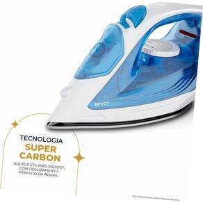 - **Modelo:** BFV07 - **Cor:** Azul e Branco - **Material da base:** Antiaderente - **Funções:** Vapor Extra, Vapor Vertical, Jato d’água - **Capacidade do Reservatório de Água:** 210ml - **Potência (W):** 127V: 1200W / 220V: 1600W - **Consumo (kW/h):** 127V 1,2; 220V 1,6 - **Dimensões do Produto:** - Altura: 13,5 cm - Largura: 10,8 cm - Comprimento: 25,5 cm - Peso: 7,1 kg - **Dimensões de Envio:** - Altura com embalagem: 13,5 cm - Largura com embalagem: 11,2 cm - Comprimento com embalagem: 26,5 cm - Peso com embalagem: 8,5 kg - **Comprimento do cordão elétrico:** 1,5 metros - **Tipo de cordão elétrico:** Giratório - **Garantia:** 360 dias (12 meses)