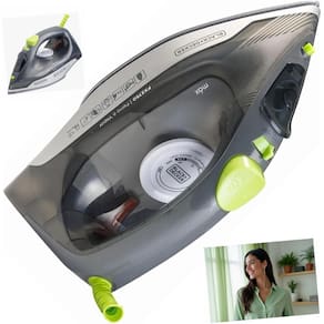 - **Marca:** Black+Decker - **Modelo:** FX2750-BR - **Cor:** Cinza escuro e verde claro - **Tipo de Ferro:** Seco ou Vapor - **Voltagem:** 110V ou 220V - **Capacidade do Reservatório:** 340ml - **Vapor:** Até 24g/min - **Cabo:** Giratório de 1,7m - **Base:** Ceramic gliss - **Potência:** 1200W - **Funções:** Vapor vertical, auto limpeza, spray frontal, vapor extra - **Garantia:** 1 ano - **Acompanha:** Copo medidor